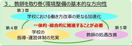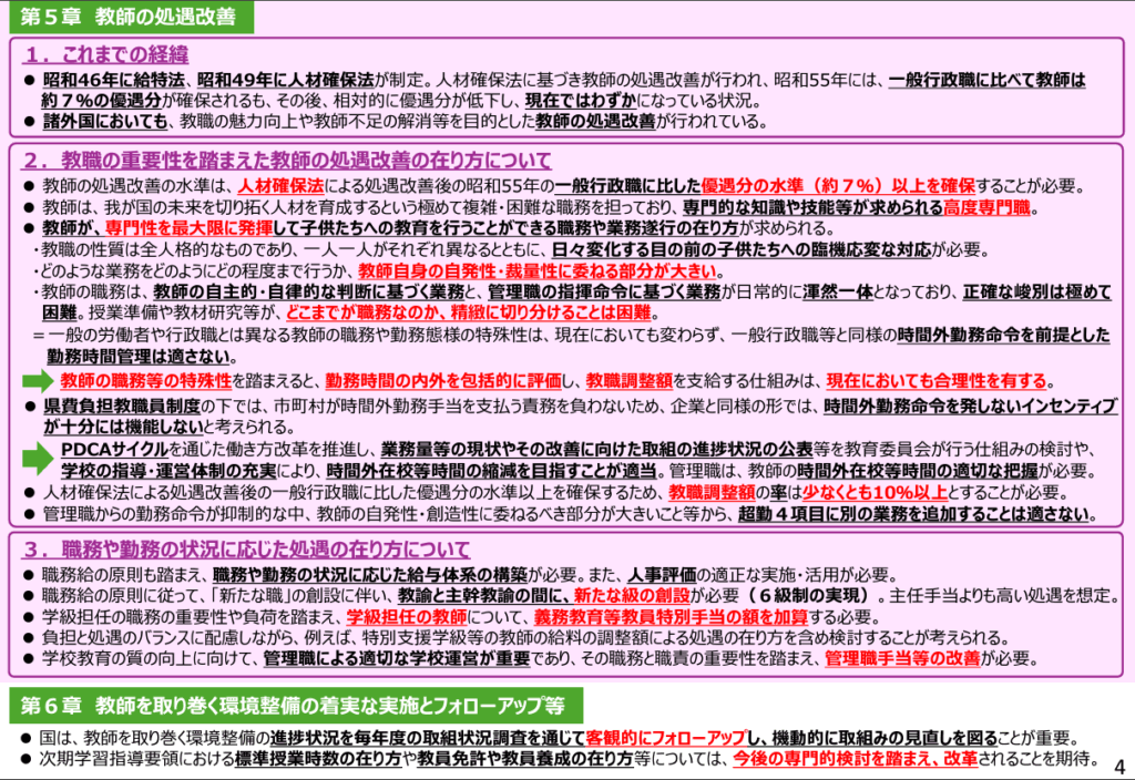 そして、今後求められる必要な措置として、第4章に「学校の指導・運営体制の充実」、第5章に「教師の処遇改善」を述べ、国に対し、第6章で「教師を取り巻く環境整備の着実な実施とフォローアップ」の必要を説き、念押しする形で取りまとめられています。