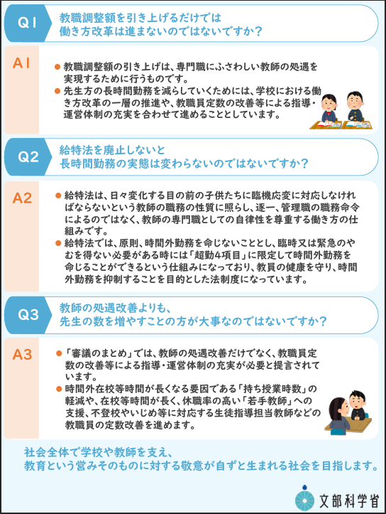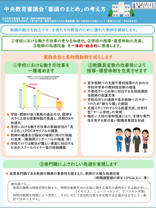 「審議のまとめ」が発表された後、一部の報道機関で、主に給特法に関して事実を誤認させるような誇張した報道があったことを受け、文部科学省は「「審議のまとめ」の考え方」を発表しました。